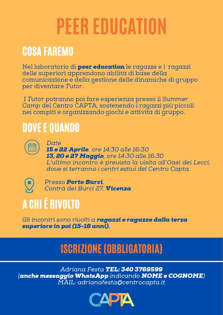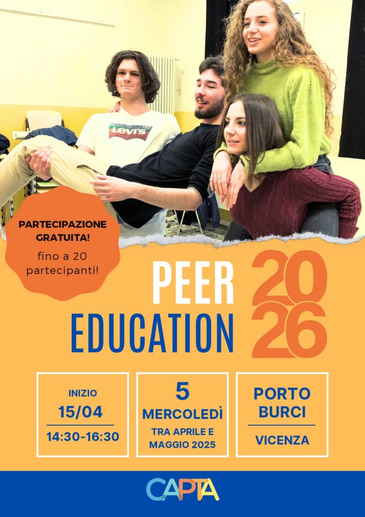 Sono aperte le iscrizioni al laboratorio di Peer Education promosso da Centro CAPTA, un percorso formativo pensato per ragazze e ragazzi delle scuole superiori (dalla terza in poi, 15–18 anni).